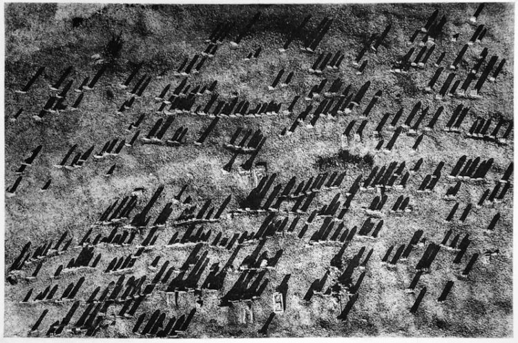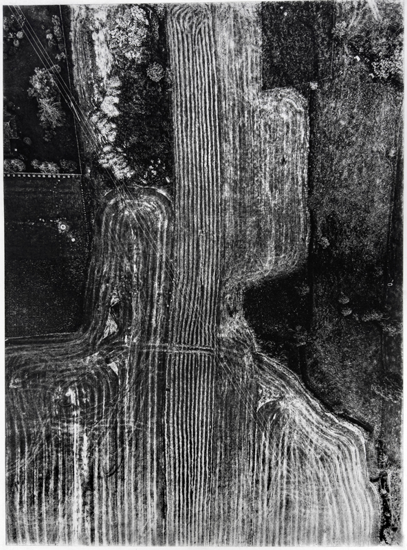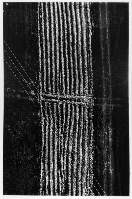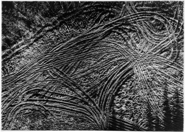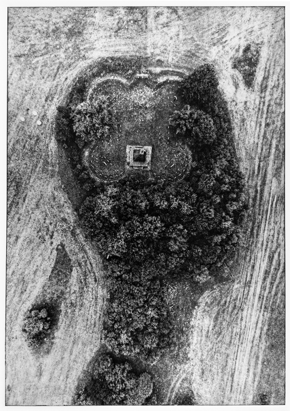 Przykładem powstania znaku graficznego in situ na skutek działalności człowieka, który udało mi się pozyskać, fotografując z góry, są heliograwiury z Mád na Węgrzech. Miejsce to, to doskonały przykład krajobrazu historycznego związanego z uprawą roli, w tym przypadku wina. Po podniesieniu drona ukazuje się fantastyczny pejzaż pięciolinii, złożony z pojedynczych krzewów winnej latorośli, często przybierający formy abstrakcji geometrycznych, organicznych i antropomorficznych, niczym powiększone do skali makro linoryty.