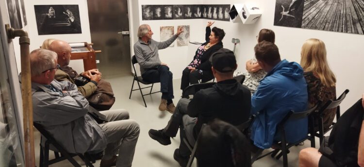 We wtorek 16 września mieliśmy okazje spotkać się z autorem wystawy Markiem Kucharczykiem, któremu dziękujemy za interesujące spotkanie. Stało się ono znakomitą okazją, by przyjrzeć się sztuce autora „Wieloświatów” jakże ekspresyjnej, pełnej emocji i intensywności przeżyć. Rozmowa dotyczyła źródeł fotograficznych dociekań i badań artysty nad ekspresją przekazu budującego w tym celu obiekty fotograficzne. Dziękujemy przybyłym gościom, których dociekliwe pytania prowadziły w głąb. Rozmowę z autorem prowadziła współkuratorka Zpafgallery – Danuta Węgiel.